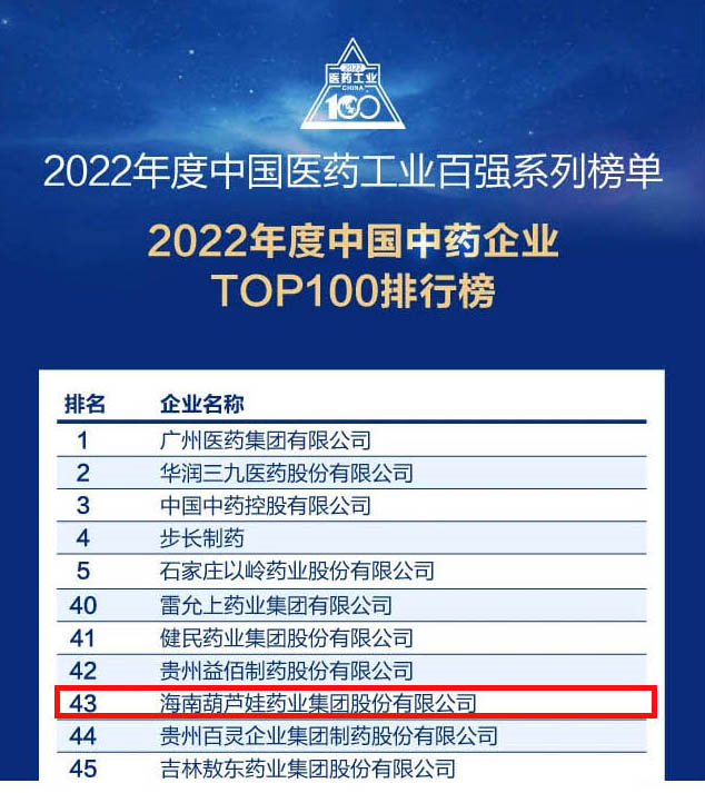 会议期间,一年一度的中国医药工业百强系列榜单隆重揭晓,AG尊龙凯时药业集团凭借领先的研发优势和扎实的生产实力以及稳健的市场推广能力,连续第四年成功入选“2022年度中国中药企业TOP100排行榜” ,排名稳步上升至第43位。
